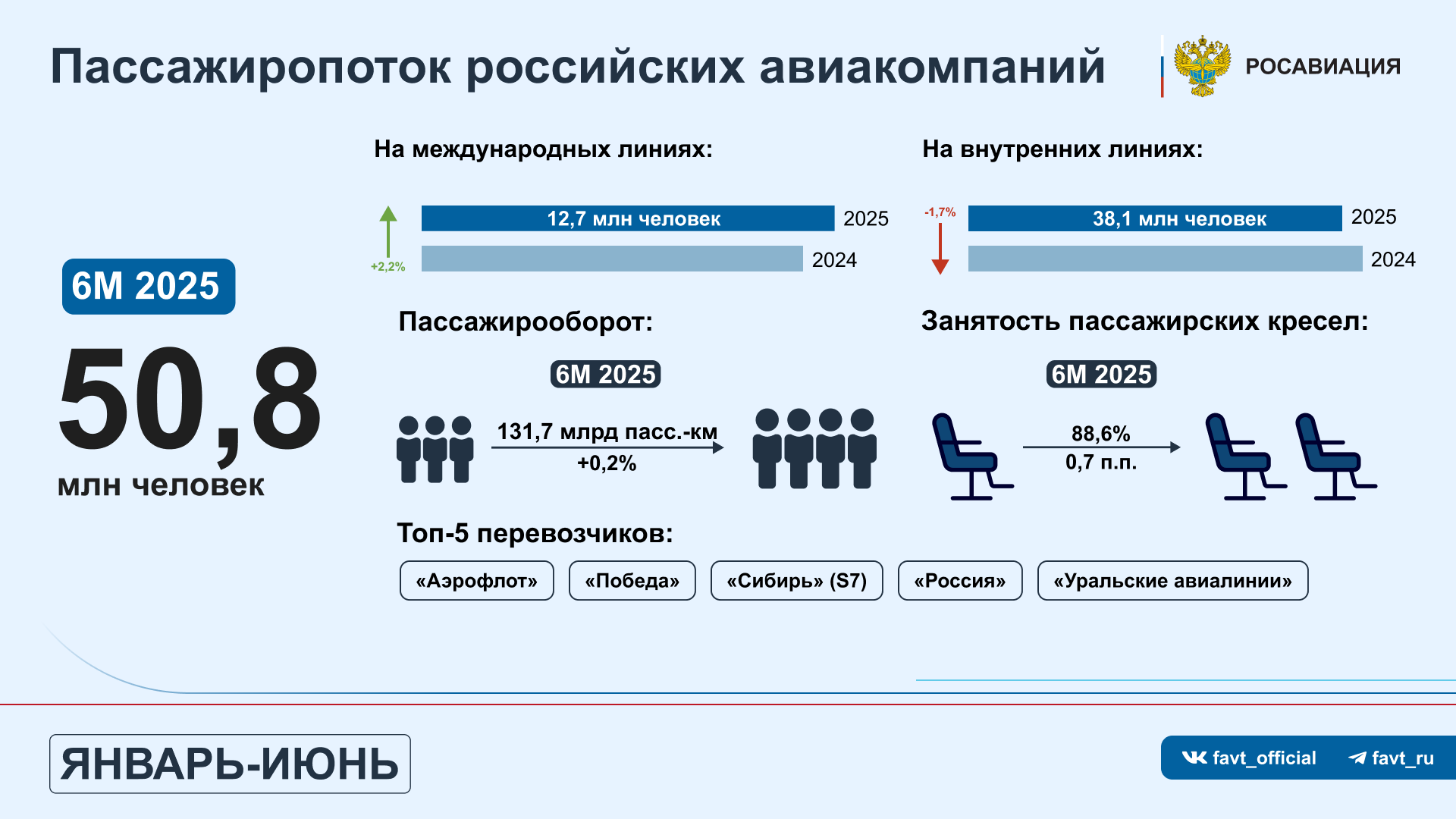50,8 млн человек перевезли российские авиакомпании в первой половине 2025 года, что соответствует аналогичному периоду 2024 года (-0,8%).
