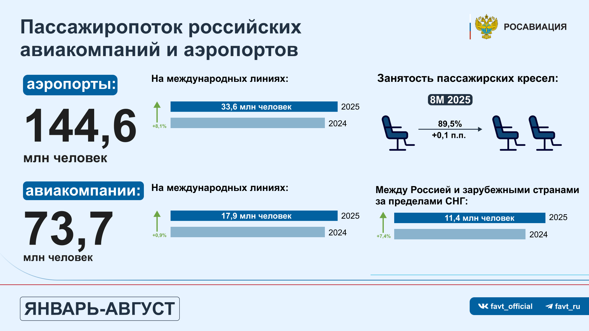 Почти 74 млн пассажиров перевезли российские авиакомпании за 8 месяцев 2025 года30 сентября 2025 21:00 Воздушный транспорт России продолжает оказывать качественные услуги по перевозке как россиян, так и гостей нашей страны. На международных направлениях пассажиропоток воздушных гаваней России вырос на 8,1% — до 33,6 млн человек, перевозчиков — на 0,9%, до 17,9 млн. Пассажиропоток на маршрутах в зарубежные страны за пределами СНГ вырос значительнее — на 7,4%, до 11,4 млн человек. Пассажиропоток лидера отрасли — группы «Аэрофлот» (помимо одноименной авиакомпании в нее входят «Победа» и «Россия») вырос на 0,7%, до 37,2 млн человек. При этом за рассматриваемый период общий пассажиропоток как аэропортов, так и всех авиакомпаний России несколько снизился: на 0,9%, до 144,6 млн человек — у воздушных гаваней; на 2,2%, до 73,7 млн — у перевозчиков. Процент занятости пассажирских кресел, напротив, увеличился на 0,1 п.п., до 89,5%. В топ-5 авиакомпаний по числу перевезенных пассажиров по-прежнему входят «Аэрофлот», «Победа», S7 («Сибирь»), «Россия» и «Уральские авиалинии». На их долю пришлось 70,3% всех перевозок. «Гражданская авиация России отработала январь-август примерно на уровне аналогичного периода прошлого года, несмотря на продолжающееся внешнее беспрецедентное санкционное давление против отрасли и периодически возникающие временные ограничения на использование воздушного пространства в ряде регионов. При этом развитие нашего воздушного транспорта не останавливается: открыли для полетов аэропорты Геленджика и Краснодара, в Хабаровске заработал новый аэровокзал для обслуживания международных воздушных линий, а в Чебоксарах начался капитальный ремонт аэродрома за счет средств фонда развития инфраструктуры воздушного транспорта. Дополнительный стимул для роста пассажироперевозок добавляет ввод безвизового режима для россиян в Китай — это позволит нарастить туристические и деловые перемещения между двумя странами, укрепить экономические связи России и КНР», — прокомментировал заместитель руководителя Росавиации Алексей Буевич, курирующий в агентстве вопросы развития авиаперевозок и международного сотрудничества. МНЕНИЕ БИЗНЕСА ![]() Александр Чугунов генеральный директор аэропорта Челябинск (входит в «Новапорт Холдинг»)